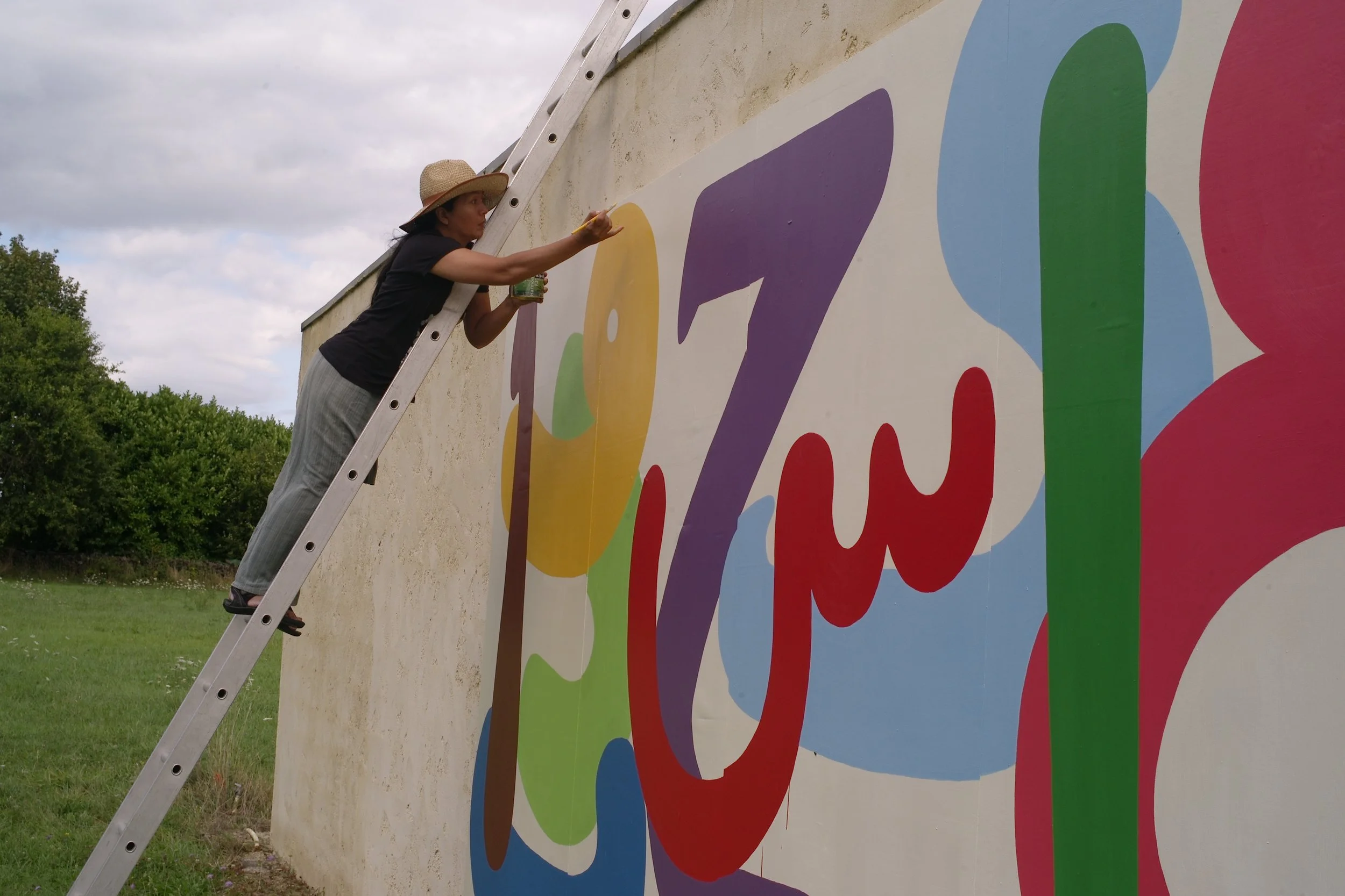 Indonesian artist Arahmaiani painting an outdoor mural visible to local farmers ploughing the surrounding fields