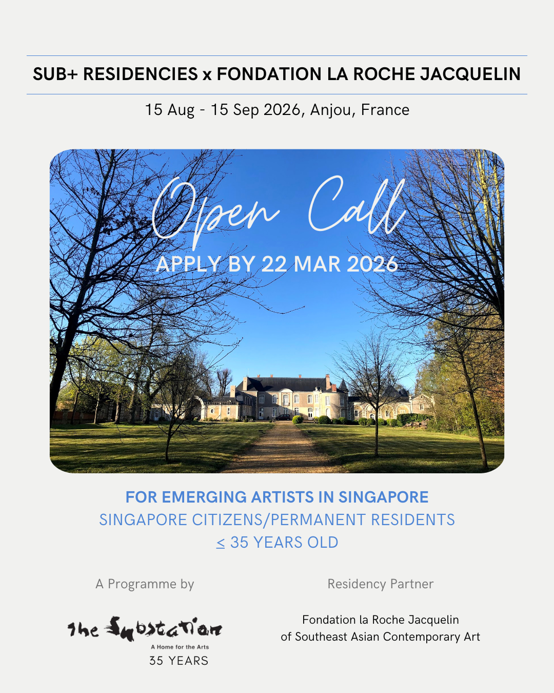 The Substation, in partnership with Fondation la Roche Jacquelin of Southeast Asian Contemporary Art (France), invites applications from emerging artists for a 30-day arts residency to take place in Anjou, France in August and September 2026. Within an increasingly accelerated arts ecology, this residency affirms the value of research, risk, and sustained inquiry across contexts.